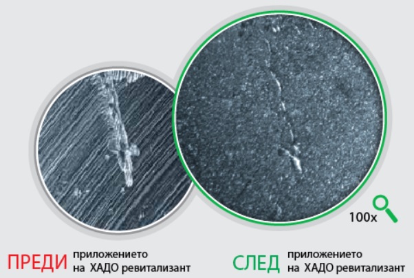 Процесът на ревитализация започва в областите с най-голямо износване, там където триенето е най-голямо. Това са места, където цялостта на металната повърхност е нарушена и връзките между атомите на метала са разрушени. Попадайки именно там ХАДО ревитализанта прилепва като магнит, към металната повърхност.